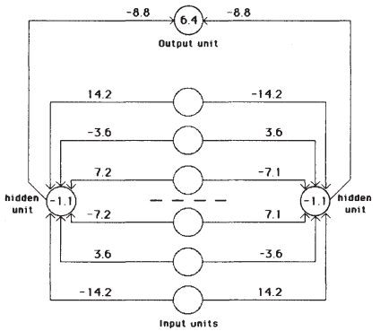 논문에서 예시로 설명하는 네트워크 이미지. 2 개의 hidden node를 사용하고 있고, 상위 계층에서 하위 계층으로 연결과 같은 계층 간 연결은 불가능하게 되어있다. 이 외에도 논문에서는 여러가지 실험적 결과들을 제공하고 있는 것 같은데, 솔직히 완전히 이해하지 못했다.