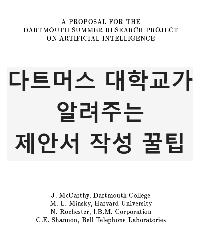 제안서 저자 4명은 각각 정보 이론을 제시한 Shannon, 하버드 신경망 연구 펠로우 Minsky (추후 Perceptron이 나오고 책까지 쓰신 그 분), 자동 프로그래밍 기술을 개발한 IBM 출신 Rochester, 마지막으로 다트머스 수학 조교수 McCarthy....인데 조교수가 이정도 레벨이라니...