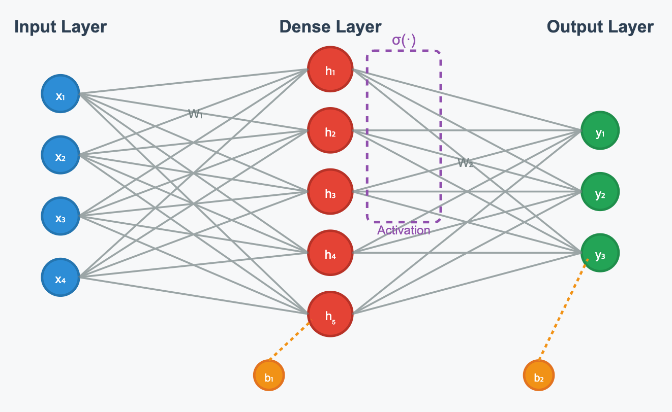 우선 딥러닝이 어떻게 동작하는지 간단히 알아보자. 우리가 흔히 접하는 Fully Connected Layer에서는, Input > Dense > Ouput 으로 데이터가 계산되고 학습된다. (순전파(입력 -> 출력 방향)로 기존에 있는 노드들의 값을 이용해서 계산하고, 역전파 (출력 -> 입력 방향)로 기존 노드 값들을 학습시킨다.)